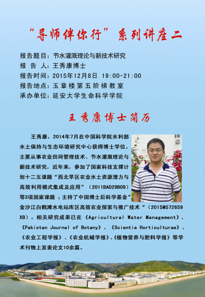 2015年12月8日晚上七点,学院“导师伴你行”系列专业知识讲座在玉章楼第七阶梯教室如期举行。本次活动邀请了学院新进教师王秀康博士担任主讲,学院副书记李学周老师,团委书记苗青老师和辅导员薛瑛老师以及14、15级学生参加了此次讲座。
