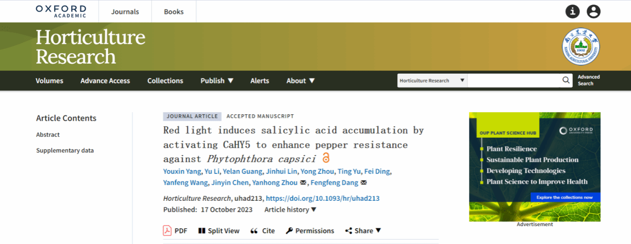 近日,beat365中国官方网站设施蔬菜团队党峰峰博士与合作者在园艺领域的权威期刊Horticulture Research杂志(中科院一区TOP,中国科技期刊卓越行动计划领军类期刊)发表了题为“Red light induces salicylic acid accumulation by activating CaHY5 to enhance pepper resistance against Phytophthora capsici”的研究论文。该研究发现,红光通过激活光信号转导途径中关键转录因子CaHY5,调控下游水杨酸(Salicylic acid,SA)合成相关基因的表达,从而提升内源SA含量来提高辣椒对疫病的抗性。该研究成果为开发基于光质的辣椒疫病防控技术提供了理论依据。beat365中国官方网站党峰峰博士为本文通讯作者,浙江大学周艳虹教授为本文共同通讯作者,江西农业大学杨有新博士为本文第一作者,beat365中国官方网站王延峰教授、福建省农科院林金辉博士和聊城大学丁飞博士等参与了该工作。