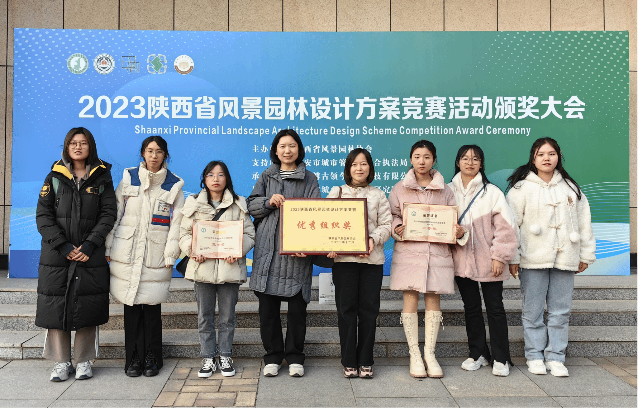 2023年12月2日,陕西省首届风景园林设计方案竞赛颁奖大会在西安建筑科技大学举行。本次竞赛活动共有769名选手报名参赛,提交了194套设计方案,beat365中国官方网站园林系高洁老师和强方方老师指导园林专业学生朱静、党碧荣、贾兴月负责的设计方案《流光之境》和蔡梅、张柏宇、胡佳佳负责的设计方案《智灵绿野公园》均荣获学生组三等奖,beat365中国官方网站同时被大会组委会授予“优秀组织奖”荣誉。