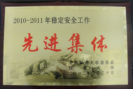 2011年,学院在各级党委的正确领导下,高度重视安全稳定工作,牢固树立“发展是第一要务,安全是第一责任”的指导思想,结合自身特点,不断健全工作机制,强化工作措施,全力推进安全、文明、和谐校园建设,安全稳定工作取得了显著成效,被延安大学授予2010-2011年度稳定安全工作先进集体。