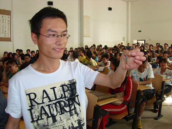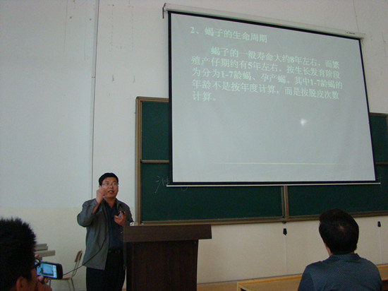 徐世才副教授结合自己的科研工作及养殖经验,从东亚钳蝎资源现状、饲养管理和前景分析等方面的内容出发,激励同学们认真学习,为今后自主创业努力奋斗。他的科研团队现场展示了实验室培育的东亚钳蝎,品尝自制“油炸黄粉虫”,并向有兴趣的同学赠送《名贵观赏动物养殖技术》书,博得阵阵掌声,现场气氛热烈。