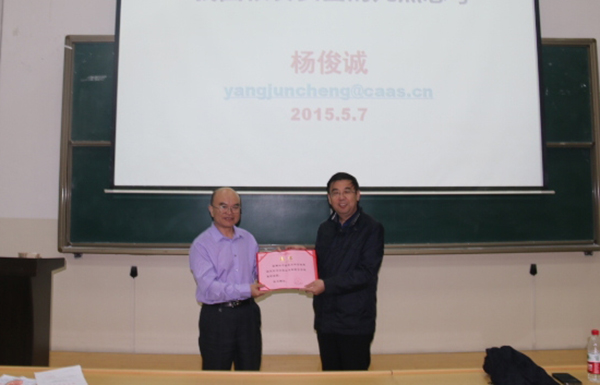5月7日下午,我校在玉章楼第五阶梯教室举行兼职教授聘任仪式,聘任中国农业科学院杨俊诚研究员为beat365中国官方网站兼职教授。副校长马勇、科研处处长王文强、beat365中国官方网站院长孙志宏、副院长张向前及部分师生代表200余人参加了聘任仪式。聘任仪式由孙志宏院长主持。