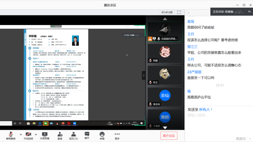 邓健老师最后进行了总结,提醒同学们无论是打算工作还是考研都要尽早确定,合理评估自己,找准定位,确定目标;在此基础上做好合理的时间规划并严格按照规划执行;同时强调复习考研和找工作都是长期战,不能急躁,要稳扎稳打,持之以恒,保持充分的自信;面对今年疫情影响的特殊情况,要合理调节情绪压力,多跟同学和老师交流经验、释放压力。