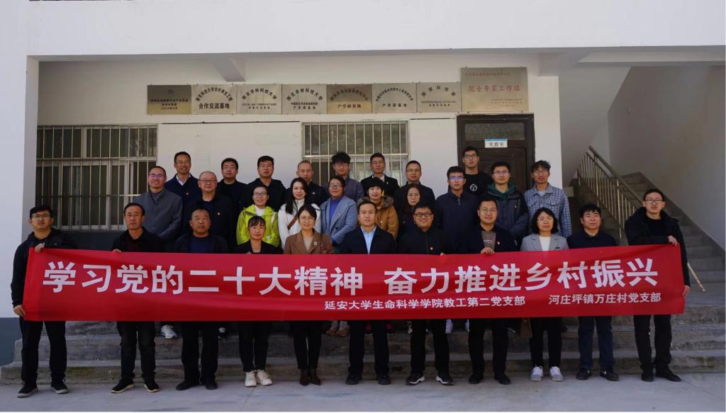 为深入学习领会党的二十大精神,切实感受近十年来农村发展变化,更好地将科学研究与乡村振兴融合,10月19日上午,beat365中国官方网站教工第二党支部与园林教研室、宝塔区河庄坪镇万庄村党支部联合开展了以“学习党的二十大精神奋力推进乡村振兴”为主题的学习活动,beat365中国官方网站党委副书记高媛媛、副院长王秀康、河庄坪镇万庄村第一书记徐亚军、村党支部书记谷延龙和教工党员、园林教研室教师、万庄村党员代表等30余人参加了活动,活动由教工第二党支部书记、园林系主任邓健主持。