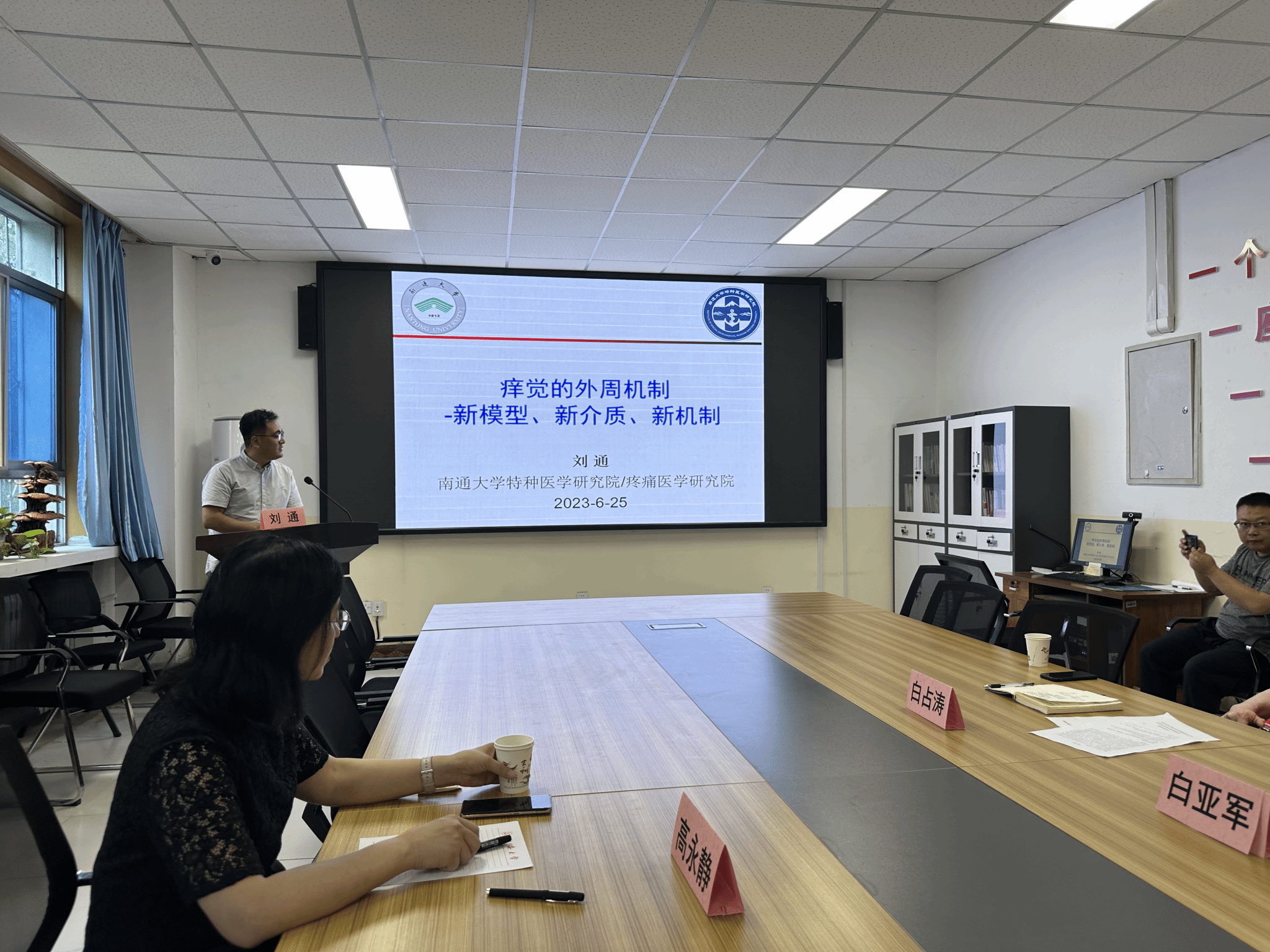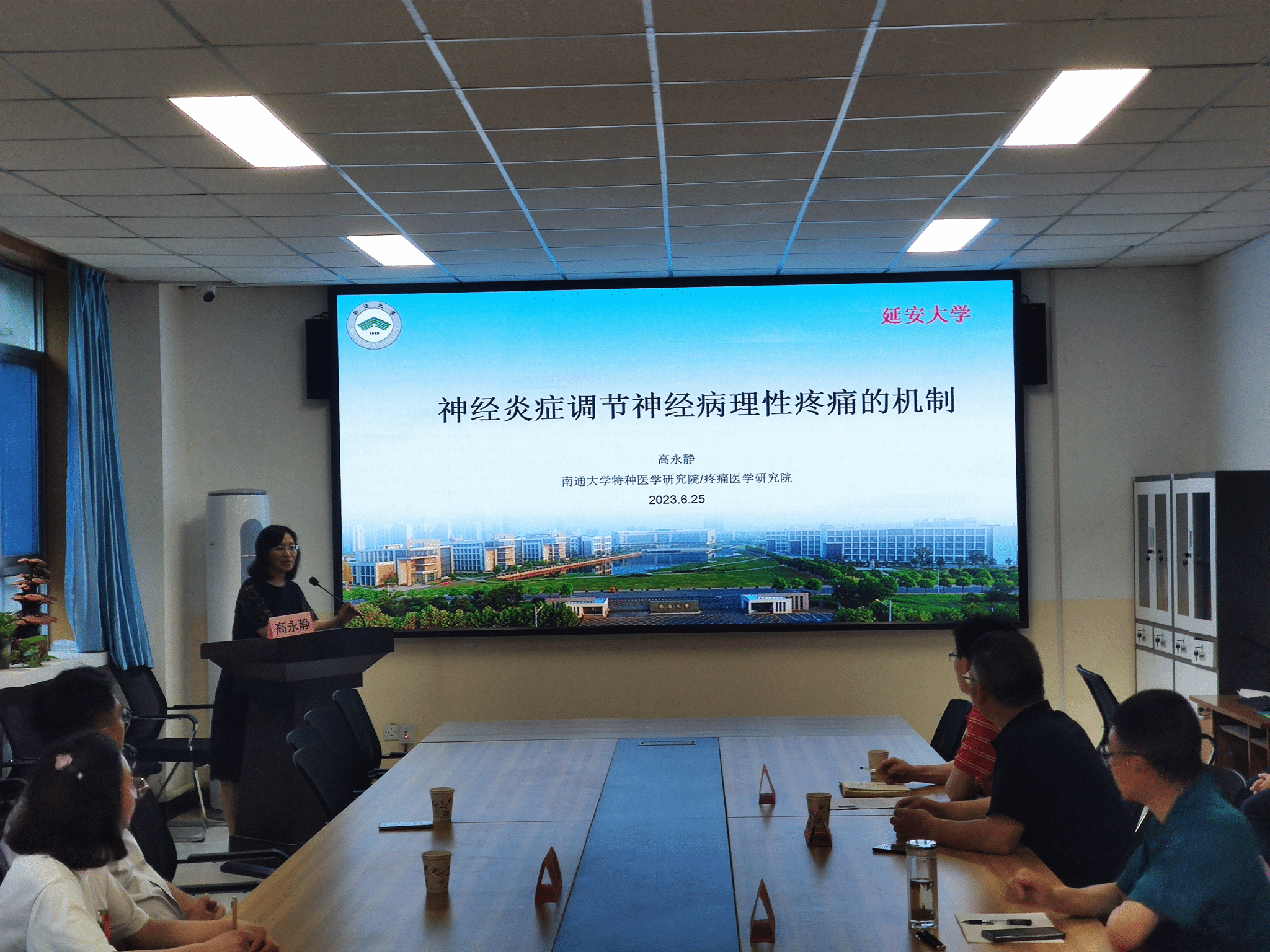 2023年6月25日上午,南通大学特种医学研究院高永静教授、刘通教授,受邀在延安大学杨家岭校区特立楼二楼会议室为beat365中国官方网站师生作题为“神经炎症调节神经病理性疼痛的机制”和“瘙痒外周机制的研究进展”的学术报告。报告会上,高永静教授就神经炎症调节神经病理性疼痛的趋化因子调控,神经细胞疼痛刺激趋化因子相关受体类型与表达的变化分析,疼痛下突触传输增强的多种基因参与感受调控等研究内容展开了细致严谨的汇报。刘通教授对瘙痒的外周机制的历史、主流科学假说、研究进展与动物模型建立做了系统的梳理与总结,并分享了课题组关于五羟色胺和瞬时感觉通道-4亚型参与的痒觉调控发生新机制的研究成果,两位教授的精彩报告引起台下教师们和研究生们的热烈讨论。