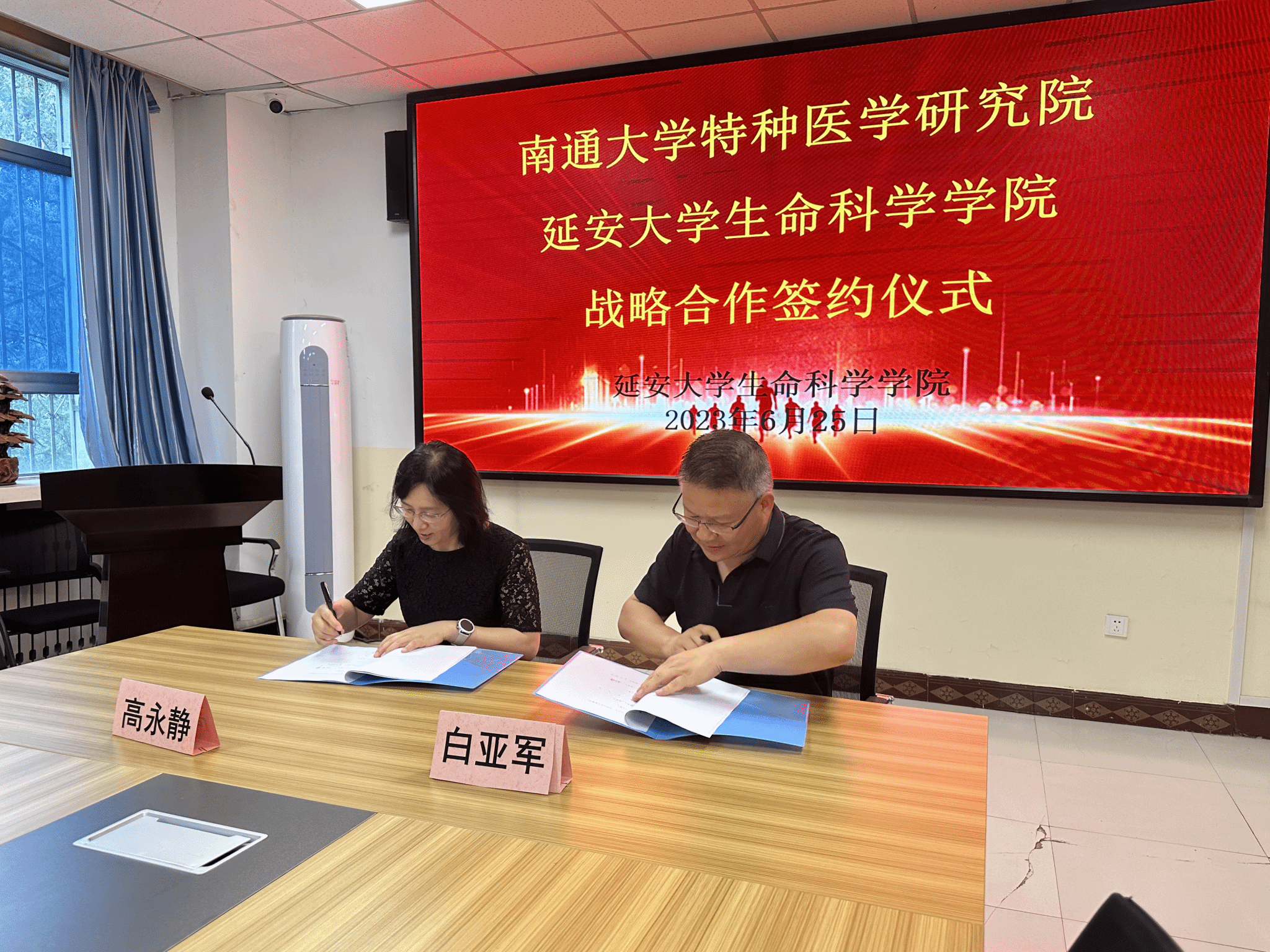 本次活动由延安大学科研处主办,beat365中国官方网站承办,白亚军书记、副院长陈国梁教授、生物学学科带头人白占涛教授以及部分青年教师和生物学研究生共计80余人参加了此次会议。期间,南通大学疼痛医学研究院/特种医学研究院与beat·365(中国)官方网站为更好地发挥双方在科学研究、人才培养与队伍建设等方面的优势,开展多层次、多领域、多形式的全方位合作,实现人才资源、科技资源、信息资源共享,以“优势互补、互惠互利”为原则,签订了战略合作框架协议书。