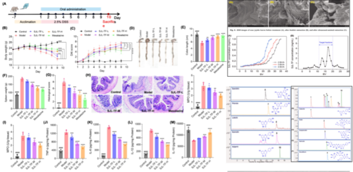 团队聚焦农业废弃物的生态价值挖掘,以药食同源植物酸枣叶为突破口,通过自主研发的超声辅助-响应面法(UAE-RSM)绿色提取工艺,高效富集酸枣叶总黄酮(SJL-TF),建立“绿色提取纯化-精准成分解析-病理干预机制阐明”一体化链条。通过动物实验和细胞实验证实SJL-TF通过调节免疫、修复肠道微生物生态平衡及黏膜屏障,显著缓解UC,推动UC的治疗从“对症治疗”向“病因生态干预”的策略转变。该技术体系大幅降低了能耗与溶剂污染风险,有力促进了生态资源的循环利用,成果发表于中科院一区TOP国际期刊Ultrasonics Sonochemistry(IF=9.7,2025年)[1]
