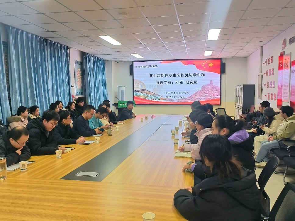 2025年12月24日上午,我校特聘教授、西北农林科技大学邓蕾研究员应邀为生态学前沿系列讲座作专题学术报告,题为“黄土高原林草生态恢复与碳中和”。报告在杨家岭校区特立楼二楼会议室举行,由生态学学科带头人王秀康教授主持,beat365中国官方网站等院系60余名师生参与交流。