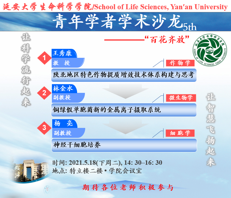 2021年5月18日下午,第五期青年学者沙龙活动在特立楼学院会议室举办,本次沙龙活动由李广伟副教授和何钊全博士主持,以“百花齐放”(“作物学-微生物学-细胞学”)为主题进行展开,由副院长王秀康教授、青年博士教师和实验师等20余人参加了此次沙龙研讨活动。